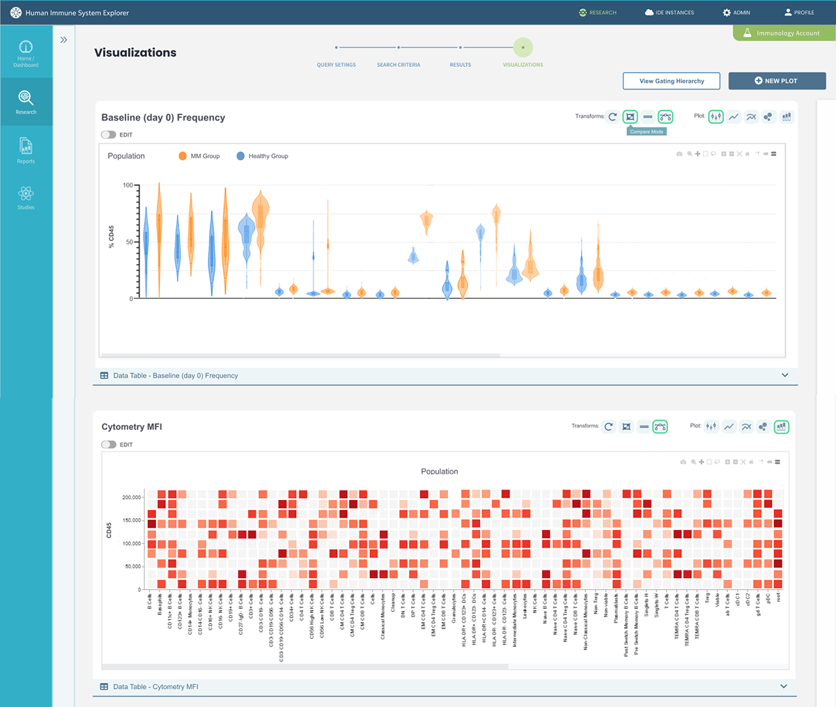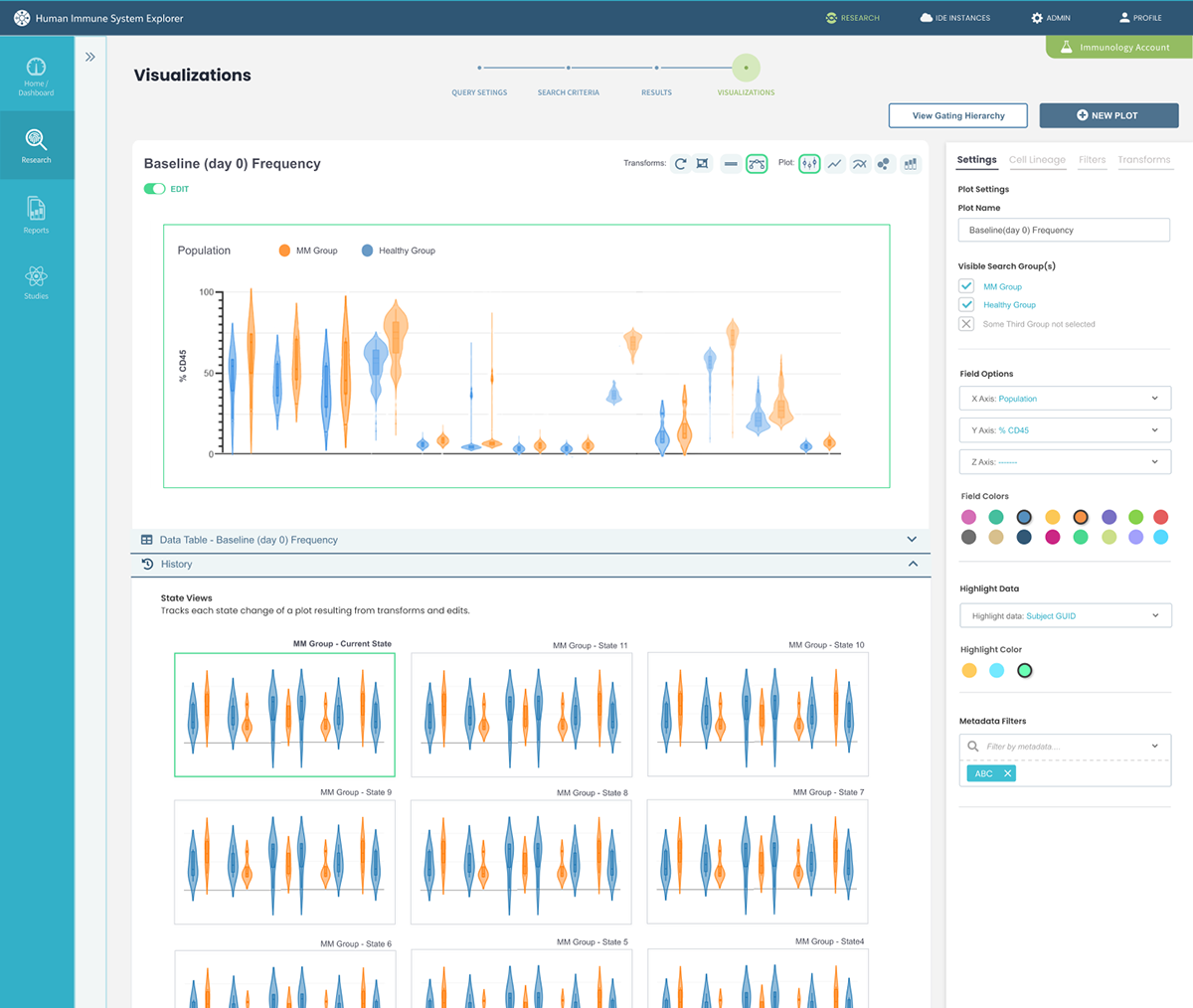 The key to meaningful immunology research goes far beyond targeting data. In fact, the bulk of their research is conducted through the interactive manipulation of visual plots. Part of the user understanding phase focused on identifying the types and combinations of plots that could best address research goals. Meaning that, rather than building plots from scratch we designed a system that immediately landed the user on a visualization page with pre-defined plots to provide instant value and a head-start on findings of potential interest.